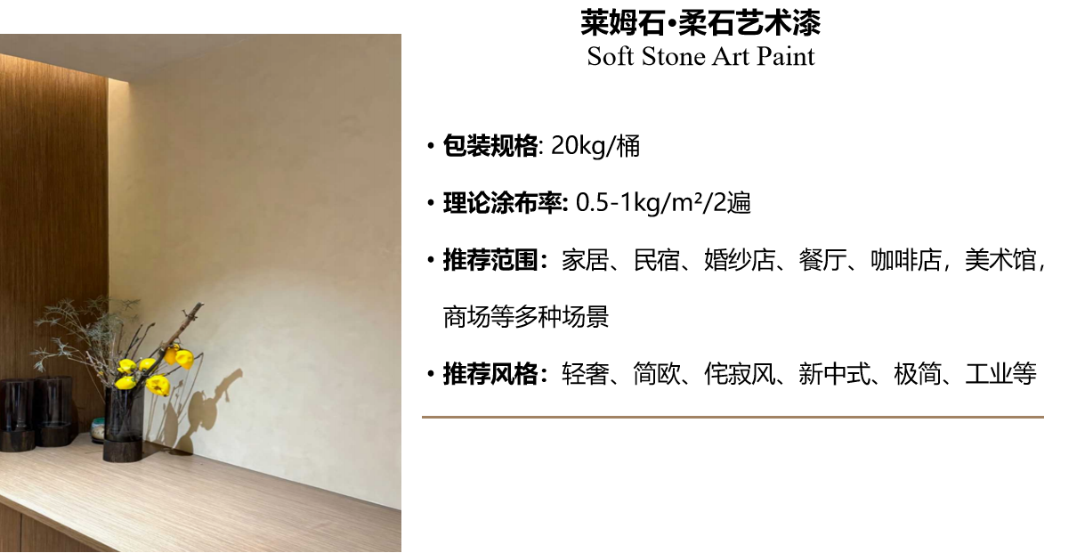 莱姆石·柔石艺术漆是一款注重自然质感,将极简主义精髓诠释得恰到好处的高端艺术质感装饰材料。该