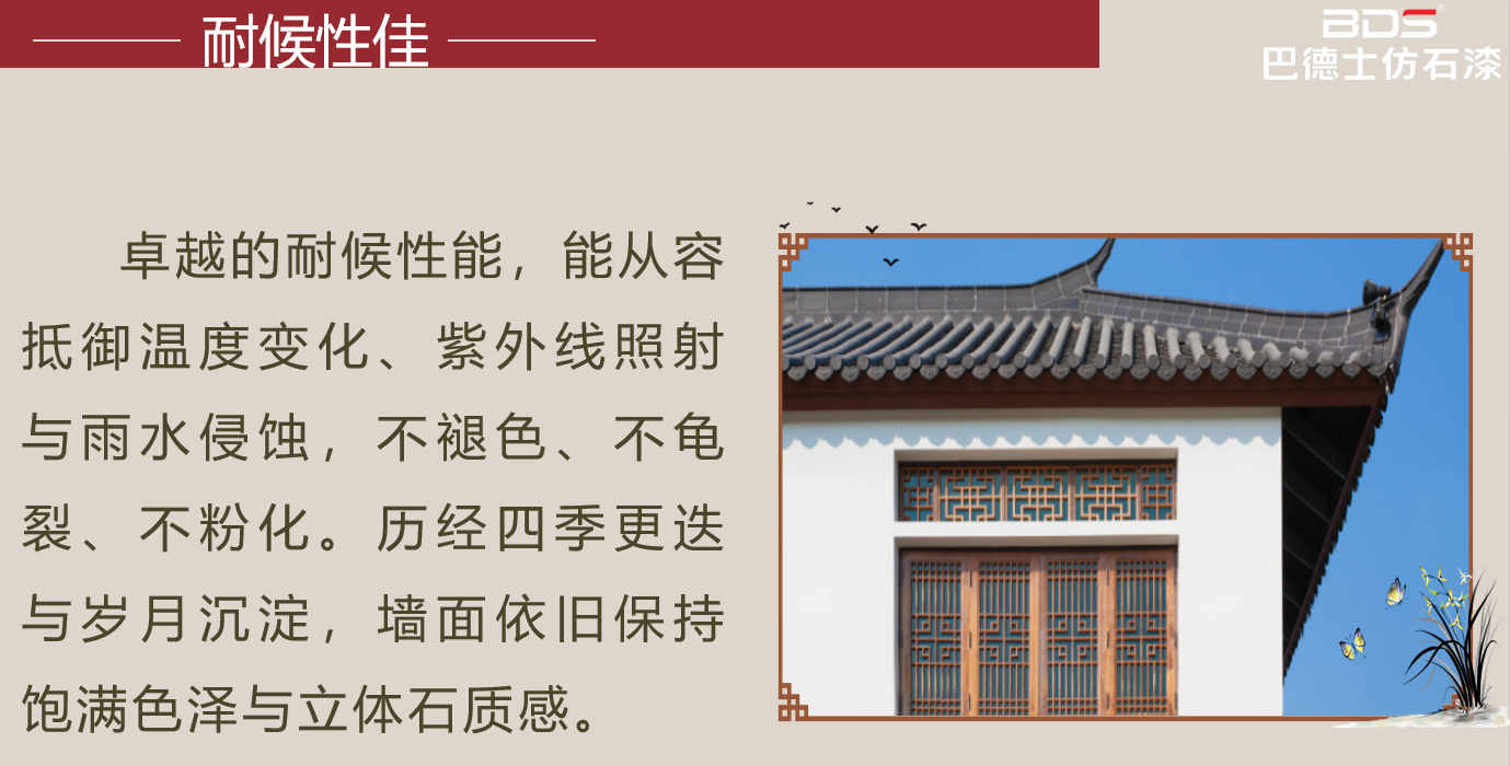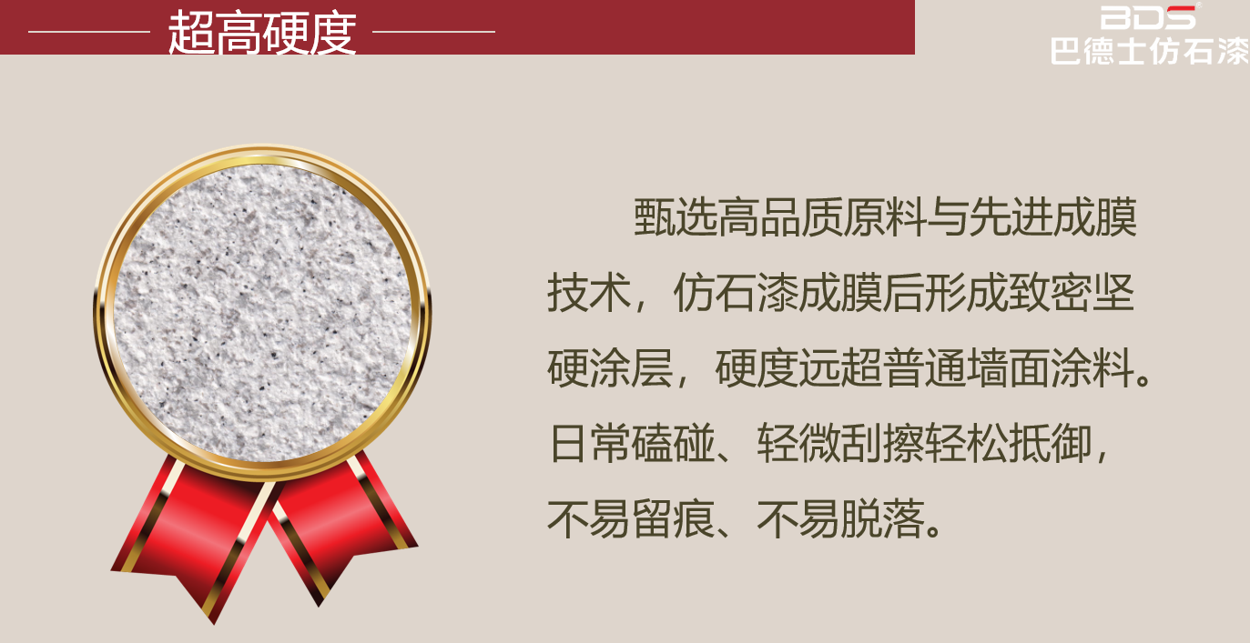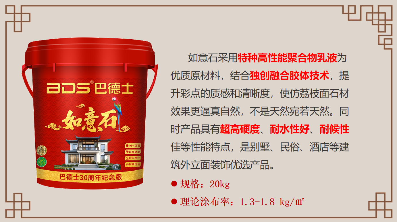 24小时服务热线如意石采用特种高性能聚合物乳液为优质原材料,结合独创融合胶体技术,提升彩点的质感和清晰度,使仿荔枝面石材效果更逼真自然,不是天然宛若天然。同时产品具有超高硬度、耐水性好、耐候性佳等性能特点,是别墅、民俗、酒店等建筑外立面装饰优选产品。
