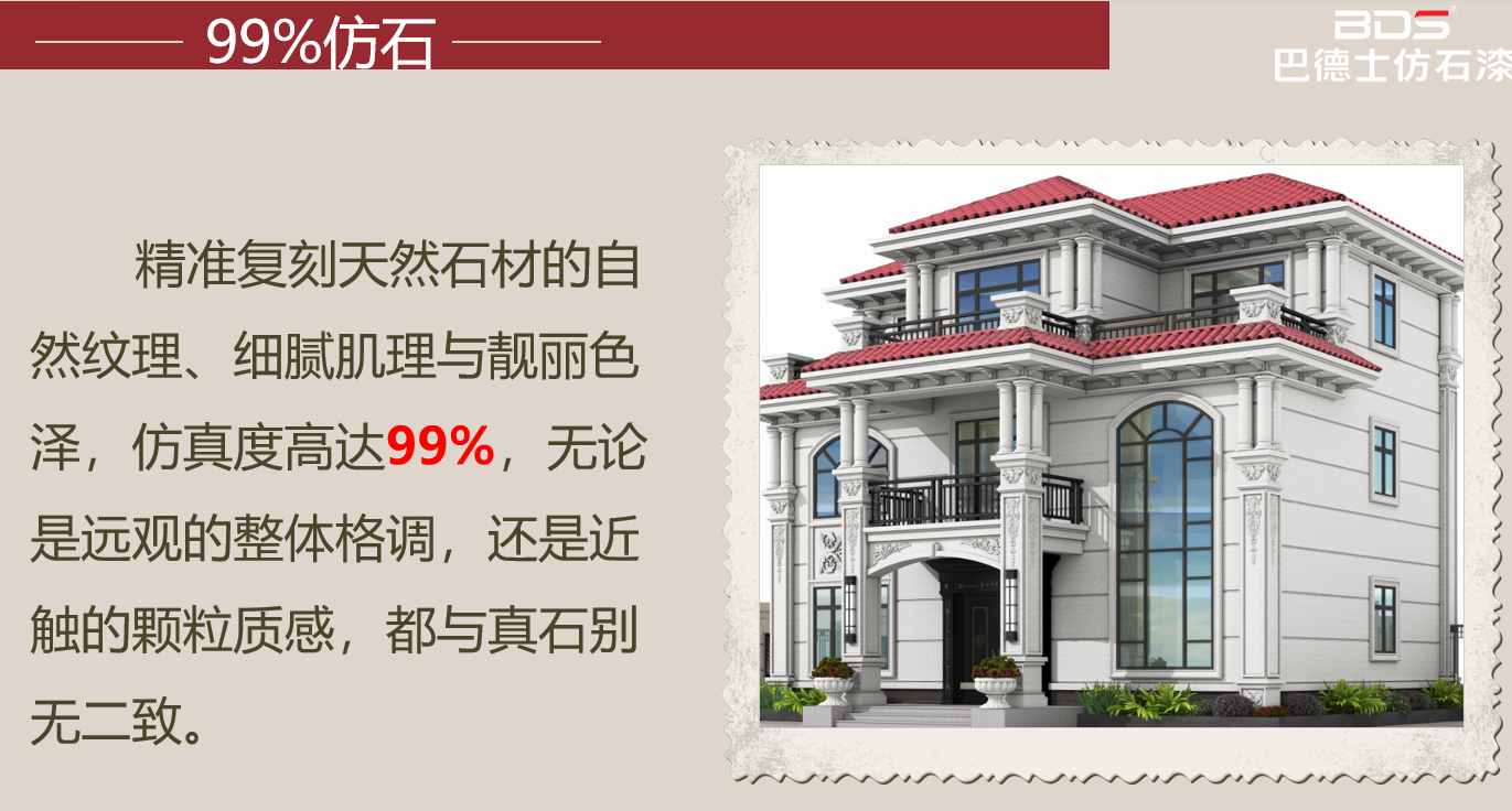如意石采用特种高性能聚合物乳液为优质原材料,结合独创融合胶体技术,提升彩点的质感和清晰度,使仿荔枝面石材效果更逼真自然,不是天然宛若天然。同时产品具有超高硬度、耐水性好、耐候性佳等性能特点,是别墅、民俗、酒店等建筑外立面装饰优选产品。